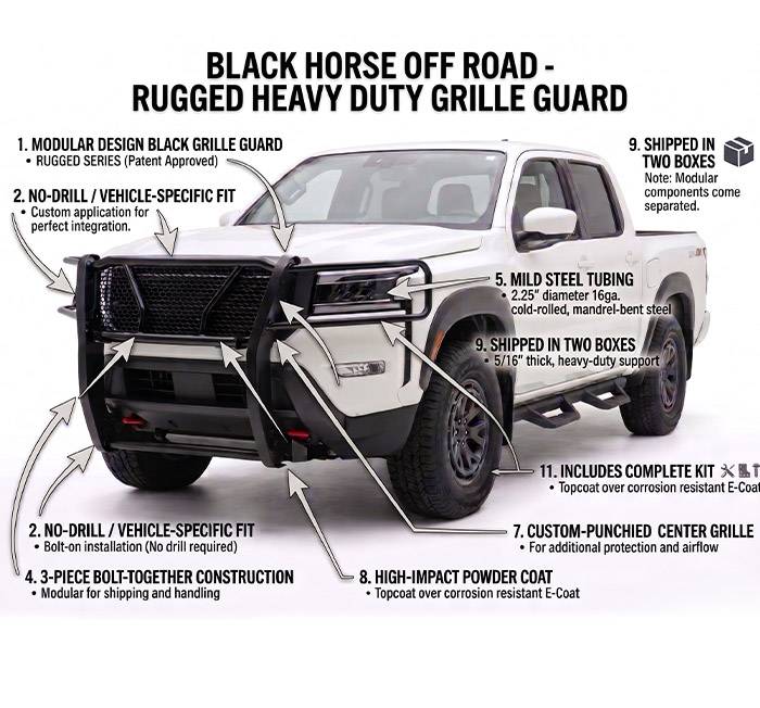 Black Horse Off-Road Rugged Series Modular Design Black Grille Guard RU-NIFR22-B - compatible with 2022-2026 Nissan Frontier