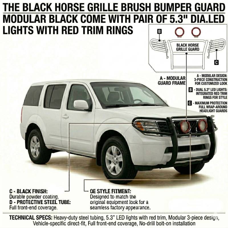 Grille Guard With Set of 5.3" Red Trim Rings LED Flood Lights-Black-Frontier/Pathfinder|Black Horse Off Road