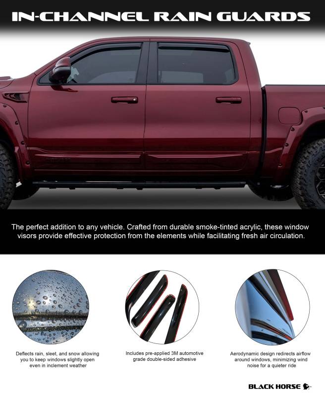 Black Horse Off Road [BHOR] |In Channel Rain Guard/Wind Deflectors|2019-2024 Ram 1500 Crew Cab|Smoke,4Pcs|#1494806IN
