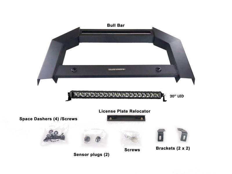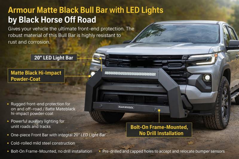 Armour Matte Black Bull Bar with LED Lights AB-GM23 by Black Horse Off Road. Gives your vehicle the ultimate front-end protection. The robust material of this Bull Bar is highly resistant to rust and corrosion.